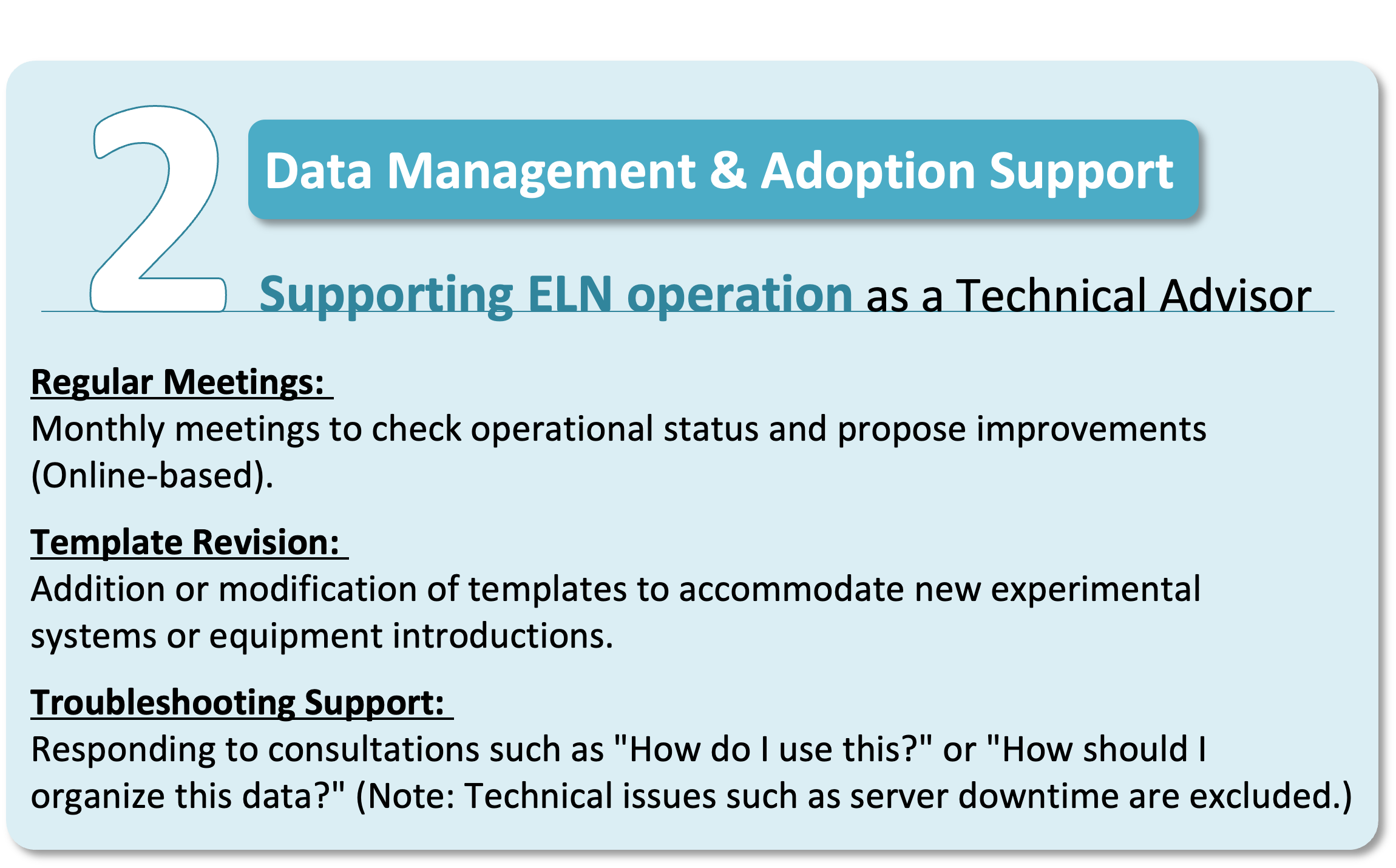 We build sustainable data infrastructures that integrate seamlessly with on-site workflows, supporting the effective implementation and adoption of Electronic Lab Notebooks (ELNs).